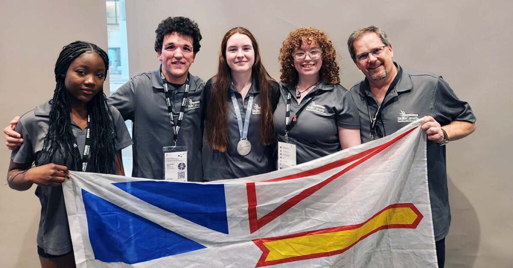 Four Holy Spirit High students represented their school and province last week at the Skills Canada National Competition 2023 in Winnipeg, MB. Covenant Oyetayo (Cooking), Sera Tulk (Graphic Design), Zachary Hall (Electronics), and Leah Casey (Job Search) all fared well in their respective competitions, with Casey bringing home a silver medal in her category. All told, over 500 students from across the country competed in over 45 competitions representing six business sectors:  Construction, Employment, Information Technology, Manufacturing and Engineering, Services, and Transportation. From left to right are Oyetayo, Hall, Casey, Tulk, and teacher chaperon Scott Fifield.