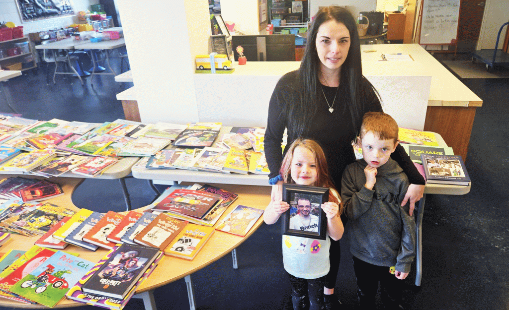 Alyssa Canning with her children Abby, left, and Dylan Lynch, presenting a donation of over 200 books to Octagon Pond Elementary in memory of Maxwell Canning, Alyssa’s only brother. Chad Feehan Local Journalism Initiative Reporter photo