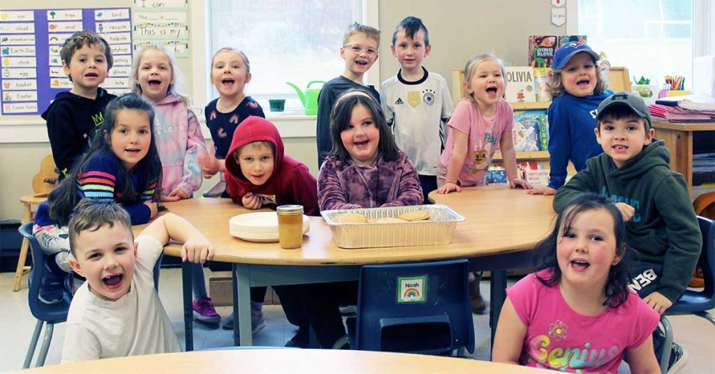 Kindergartners at Holy Cross Elementary in Holyrood had a pretty sweet assignment this spring. Over the past month the students tapped some nearby maple trees for their sap, collecting enough to enjoy the fruit of their labours last Friday. After the clear sap was all boiled down in the school’s cafeteria there was enough delicious homemade syrup to pour over a batch of fresh pancakes. “First we had to tap the trees, and then we put buckets underneath the taps, and then we collected the syrup, and then we sent it to the cafeteria, where they boiled it, and turned it into maple syrup,” explained student Thatcher Fitzpatrick. Fellow student Ben Corbett noted the class made four trips outside to tap the trees. The idea came from their teacher Stephanie Edison who had noticed several tapped maple trees throughout Holyrood on her morning drive to school. She decided it would be a good lesson for the students, who gladly tapped into the idea. And what was the best part of making the syrup? “Tasting it,” said Lyla Green. Edison said students were able to taste the sap straight from the trees. Seated on the floor is Nathan Burke and Danielle Squires. From left are Scarlett Travis, Ivar Veretennyk, Claire Boyd, Leah Coffey, James Murphy, Lyla Green, Maverick Furey-Bartlett, Thatcher Fitzpatrick, Naiya Derwin, Ben Corbett, and Nicholas Parsley. Missing from the photo is Noah Olson. Mark Squibb photo