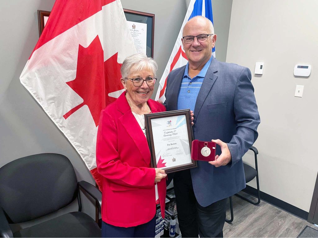 Topsail-Paradise MHA Paul Dinn has presented a number of 75th Anniversary of Confederation Medals to recipients in his district over the last number of weeks, such as Patricia Burton of Paradise, pictured, who has volunteered with a number of community organizations over the years. Other recipients have included Peter ‘Glad’ Duff of CBS, Judy Sparkes of Paradise, and Bernie and Lousie Mercer of CBS. The medals, announced as a part of the Province’s celebration of the 75th anniversary of Confederation, recognizes people who have made significant contributions to their communities and the province over the past 75 years. Submitted photo