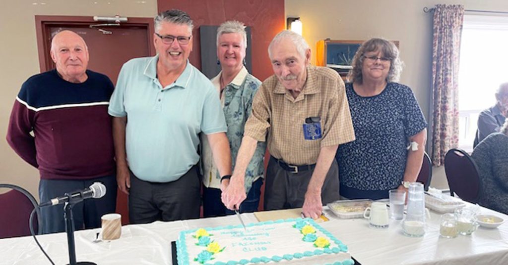 The Age Friendly Club celebrated its first year anniversary on July 7. It started with 32 members and now has 90 and is still growing, said founder Wilfred Bartlett. Present at the event was Mayor Darrin Bent and councillor Christine Butler who joined the celebration, which included a good meal and a game of cards. On hand from left, are Jerry Hynes, Christine Butler, Mayor Bent, Wilfred Bartlett and Sylvia Noseworthy.