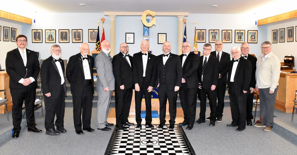The Scottish Freemasonry Society held an open house at its lodge in Chamberlains CBS on February 28. It attracted members of the public, members of other Masonic Lodges around the province, and CBS Mayor Darrin Bent, who dropped by to wish them well. The lodge is located in what used to be St. Andrew’s Schoolhouse. Among those attending the open house were, from left: Aaron Abbott, Gary Burgess, Paul Miller, David Jarvis, Kenneth Thistle, Tom Jensen, Mark Lane, Ken Way, David Butt, Karl Garrison, Warren Dinham, Larry Bradley, and Mayor Darrin Bent.