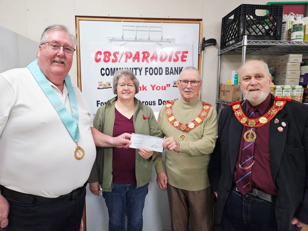 Members of the Prince of Orange Loyal Orange Lodge No. 23 in Kelligrews recently presented a cheque to the CBS/Paradise Food Bank on behalf of The Loyal True Blue and Orange Home of Richmond Hill, Ontario. In the Christmas Sentinel, the Ontario lodge members offered to donate $1,000 to any registered charity sponsored by a fellow lodge. On hand for the presentation were, from left: Prince of Orange Lodge Treasurer Randy Butler, the Food Bank’s Faye Dawe, Worshipful Master Derek Tizzard and Recording Secretary Donald C. Smith. The Prince of Orange brothers thanked their fellow brothers and sisters at the Loyal True Blue & Orange Home for their generosity. The Richmond Hill Lodge was founded in 1921 and operated the home as an orphanage for many years. These days, the Lodge members operate it as a childcare centre.