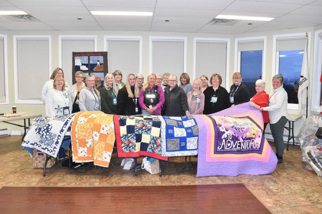 A WARM HUG FOR THOSE IN NEED—Members of the Ocean View Quilters Guild donated 28 handcrafted quilts to the Royal Newfoundland Constabulary’s Crisis Response Team last week. The quilts will be used at the officers’ discretion to provide comfort to people they are helping through traumatic situations. The presentation took place at the CBS Lions Den in Long Pond where the 75-member guild meets monthly. On hand for the presentation were, starting in the front row, from left: Jill Camp, Regina Walsh, Jennifer Peddle Sheila Wooley, Crisis Response Team Social Worker Shelby Stone, RNC Cst. Stephanie Carter, Donna Nolan, Valerie Gregory, Barb Ralph, Cindi Farrell, and Trudy Strowbridge; and in the back, from left: Penney Pearcey, Kathy Dawe, Bev Butt, Sheila Ford, Theresa MacLean, Pat Best, Nancy Parsons, and Cathy Grandy. Absent from the picture is RNC Sgt. Julie Cunningham who helped initiate the project. Craig Westcott photo